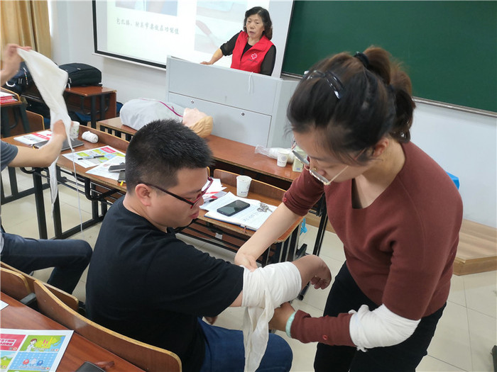 培训主要涵盖理论知识和实践操作两大板块。培训老师就应急救护知识概念、心肺复苏、创伤救护、逃生避险、常见意外伤害的急救处理等知识进行详细的讲解。重点介绍了胸外心脏按压、气道异物梗阻的操作,通过图文结合的方式,详细讲解了突发事故第一目击人急救的步骤、方法及如何抓住最有效的“黄金三分钟”时间去挽救更多的生命,对体征评估、呼救求援、体位调整、胸外按压、人工呼吸等步骤详细阐述了救援操作要领。在实践操作环节,培训老师先进行了止血包扎、骨折固定、AED操作、人工呼吸等常用救护技能的示范操作,随后学员们对“止血包扎”进行了模拟练习并采用专业人体模型对心肺复苏术作了详细的分步示范演示,学员们按三组进行逐一练习,通过操作人体模型、现场提问等方式进一步巩固了所学知识,掌握了现场急救的基本技能。最后,参加技能考核的36名学员全部通过并获得了《红十字初级救护员证》的资格证书。