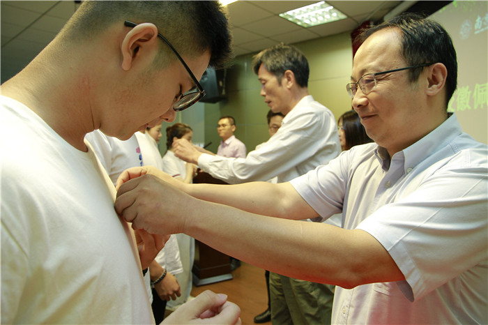 典礼上,全体新生举行了庄重的佩戴校徽仪式,学院领导为新生代表佩戴校徽。