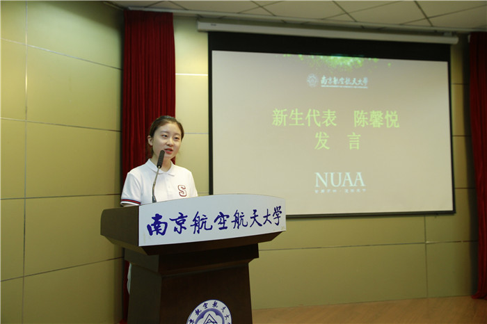 国际贸易与商务专业学生陈馨悦作为新生代表发言。她表达了初来南航的激动心情和奋发图强、持之以恒的决心。