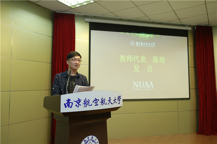 应用外语系教师陈培作为教师代表发言。他结合自己的经历与感悟,与同学们分享了如何尽快适应大学生活的经验,鼓励同学们要有明确的学习目标,要学会自律,要懂得诚信。