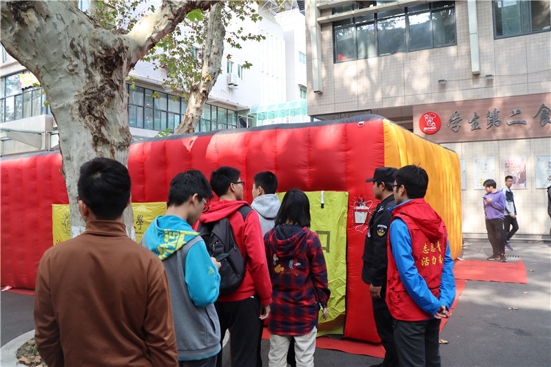活动中,党员同志身着醒目的红色志愿服提前到达宣传现场,分组做好校园消防安全宣传展的引导、宣传工作。一方面,为教职工及大学生讲解消防知识和消防自救知识;另一方面,为大家讲解展示区内的各种消防实物如安全标识、消防器材等的功能和作用。同时, 为使大家对火灾和灭火有一个更加直观全面地了解,他们还引导师生们体验119模拟报警、消防模拟逃生屋场景等。