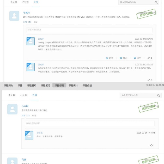 课后任课教师通过平台或QQ群回答学生疑问,布置课后作业,督促学生及时完成作业。