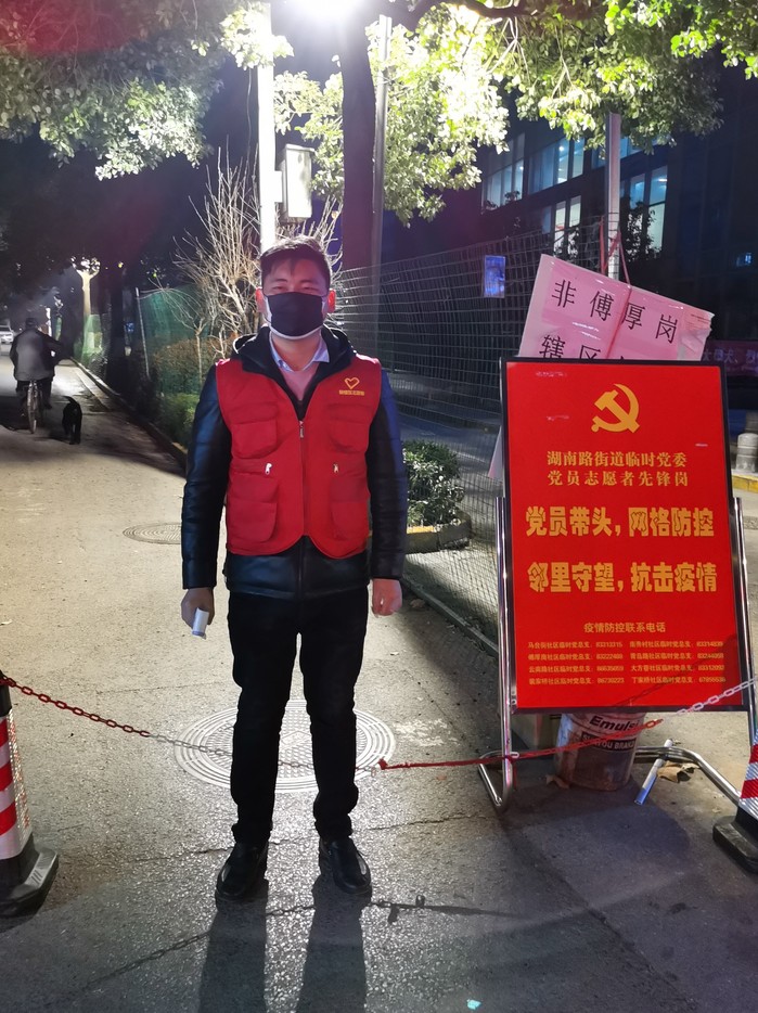 在全国上下合力抗击新冠肺炎疫情的关键时刻,学院除了身处全国各地的学生加入了抗“疫”志愿者的队伍,还有一位教工党员也在其中,他就是学院辅导员熊啟龙老师。熊老师的志愿服务地点位于自己所在的鼓楼区湖南路街道傅厚岗社区,主要负责为进入社区的人员和车辆进行证件检查、体温测量、指导填写“宁归来”APP等工作。