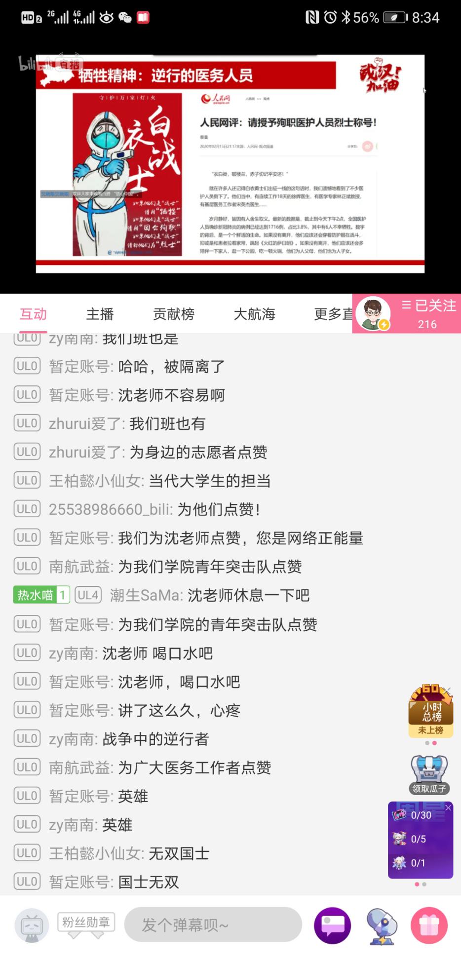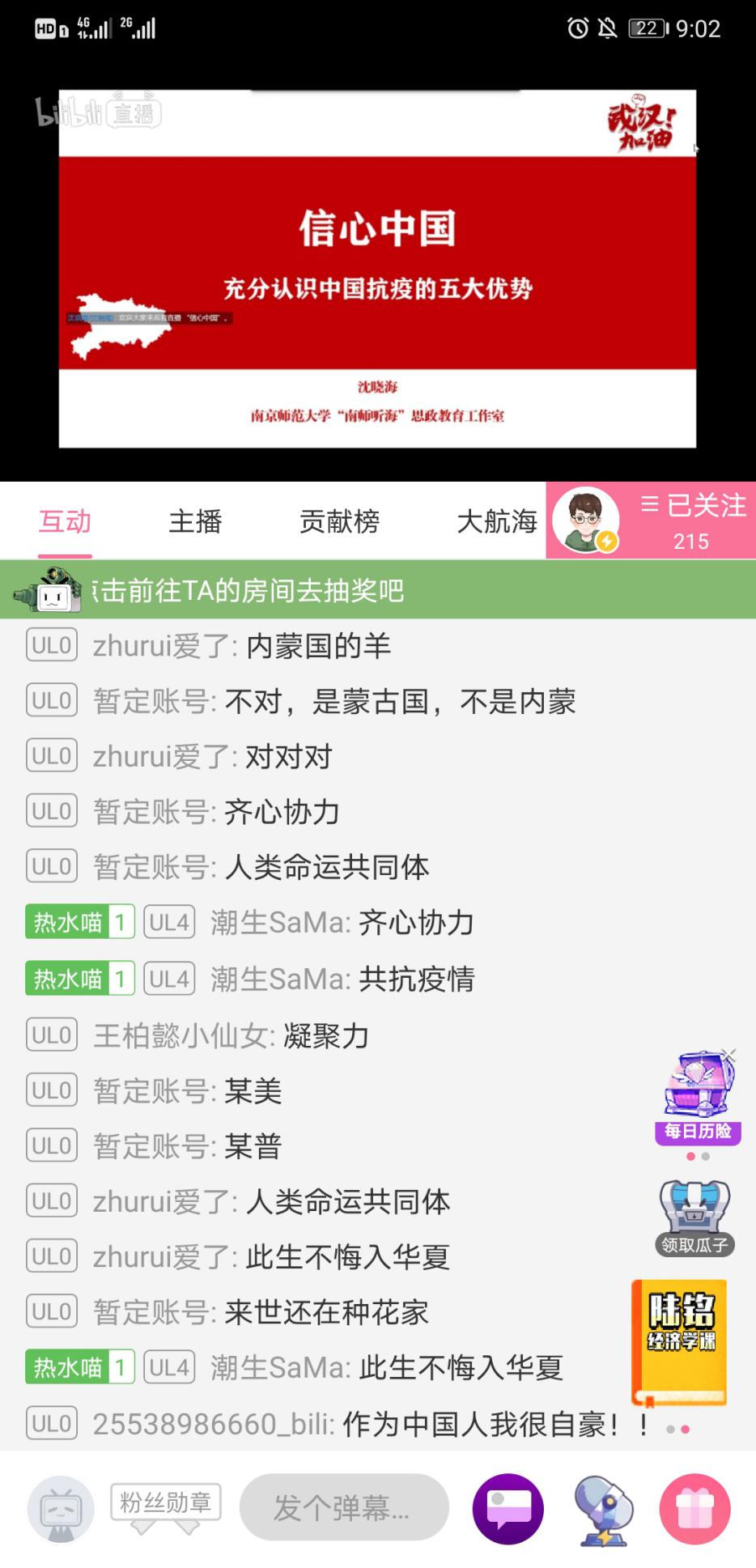 沈晓海老师从“集中力量办大事的国家体制优势;始终把人民放在首位的立场优势;动员群众、依靠群众的路线优势;舍身忘己、全力以赴的精神优势;建设人类命运共同体的理念优势”等方面,结合视频资料向师生们生动地讲述了疫情期间“全国一盘棋”的伟大战略部署、再现了“雷神山”“火神山”医院的“中国速度”,重温了疫情防控中医务人员的感人瞬间。两个多小时的讲座引发了师生们的热烈讨论与积极思考,期间互动频繁,弹幕不断,在沈晓海老师的娓娓道来中,“中国智慧”“中国精神”“中国速度”“中国温度”“中国担当”展现地淋漓尽致。