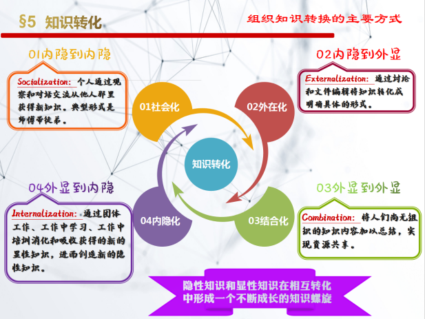接下来,赵宇院长运用丰富的案例向大家系统讲解了知识分类、显性和隐性知识的界定,并介绍了显隐性知识转化的四种方式。她结合工作实际,指出在实际工作中大家应该注重隐性知识向显性知识的转化,促进知识的交流和共享。
