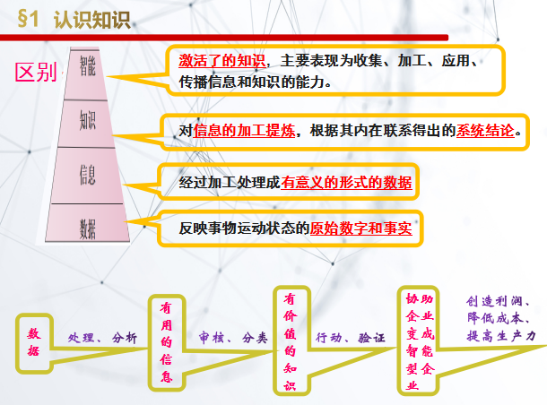 赵宇院长首先从知识基本概念展开,通过数据、信息、知识、智能四个方面引申出一条由低到高、有浅入深、由易到难的人们认知的过程。她将这四个层次联系到实际工作中,让大家思考如何能够提高站位,提升工作效率和水平。