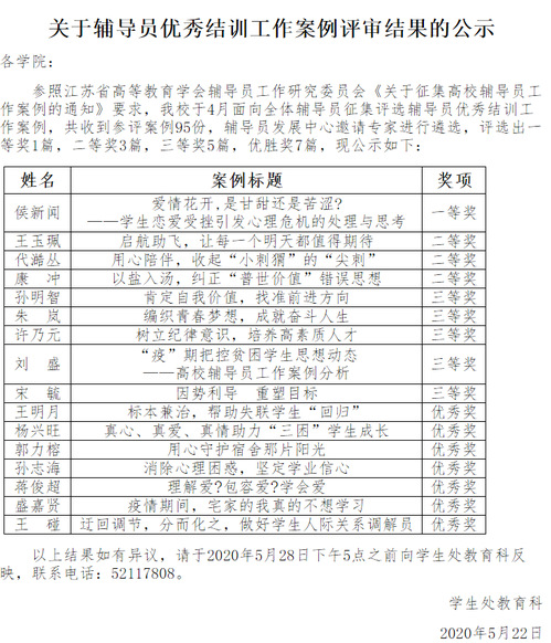参加培训的辅导员全部保质保量完成了学习任务,并按照学校要求,与国际教育学院辅导员一同组成校全国高校辅导员网络培训第五小组,组织了两次学习研讨交流会,分享培训的收获和体会,并提交了辅导员工作案例。培训结束后,学校组织了辅导员优秀结训工作案例评选,在收到的95份参评案例中,评出了一等奖1篇、二等奖3篇,三等奖5篇,优秀奖7篇。我院辅导员宋毓题为《因势利导 重塑目标》的案例获得三等奖。