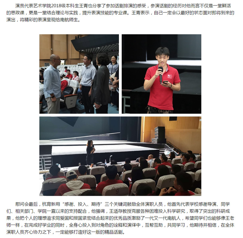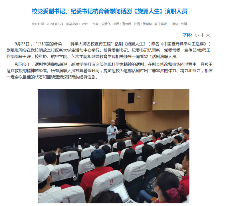 本次话剧,我院2017级广播电视学专业江天翔和2018级交通运营管理专业李云飞参演其中,两位同学带着对主人公的崇敬、对话剧的热爱积极参加排练。他们认为,这不仅是一次令人难忘的体验、更是一次南航精神的传承,让他们在未来的学习道路上有更足的动力和信心,乘风破浪、勇往直前。 在两位同学的排练过程中,学院一直关注他们的排练和学习情况,鼓励他们要向王适存先生一样有战胜困难的能力和勇气,有勇于攀登的精神和毅力,有报国之志和强国之心。