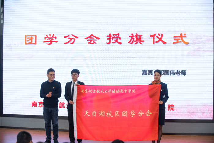受聘仪式上,邓国伟向团学分会主席团代表授旗并讲话。讲话中,邓国伟对团学分会上一学年在改革创新、思想引领、与基层团支部联动等方面工作中所取得的成绩表示了肯定,并对2020届团学分会提出了三点要求:一是要不忘初心,牢记服务同学的责任使命;二是要锤炼过硬本领,做一名有内涵、有实力、有魄力、有魅力的学生干部;三是要公道正派,以身作则,公私分明,努力建设充满朝气、干净纯粹的组织文化。希望天目湖校区团学分会的同学团结协作,将学院天目湖校区团学工作提升一个新台阶。