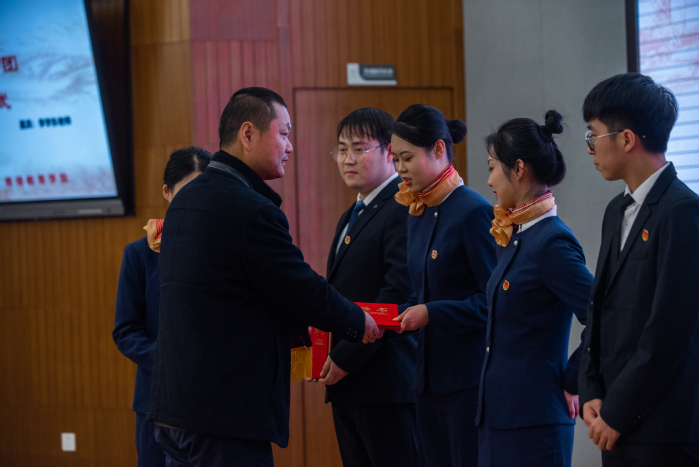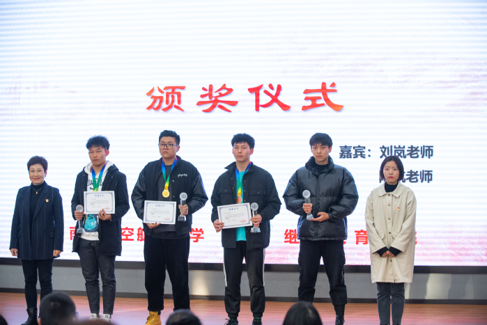 仪式开始,与会师生起立共唱团歌。首先进行的是“‘羽’你同行,‘篮’不住的激情”首届篮球、羽毛球联赛颁奖仪式。自11月24日联赛开赛以来,来自不同年级、专业的10支篮球队、30位羽毛球选手挥洒汗水、奋勇拼搏,经小组赛、淘汰赛、决赛多轮角逐,最终Mr.队、Team Cooperation队、曼走队分别斩获篮球项目冠亚季军,高斌、张源驰、孙金龙、肖雨婷、孙瑞、朱雯倩六名同学在羽毛球比赛中位列前三。颁奖仪式上,团学分会指导老师熊啟龙宣读了获奖名单,学院驻校区办公室主任刘岚及辅导员代表为获奖运动员颁发了奖牌和荣誉证书。