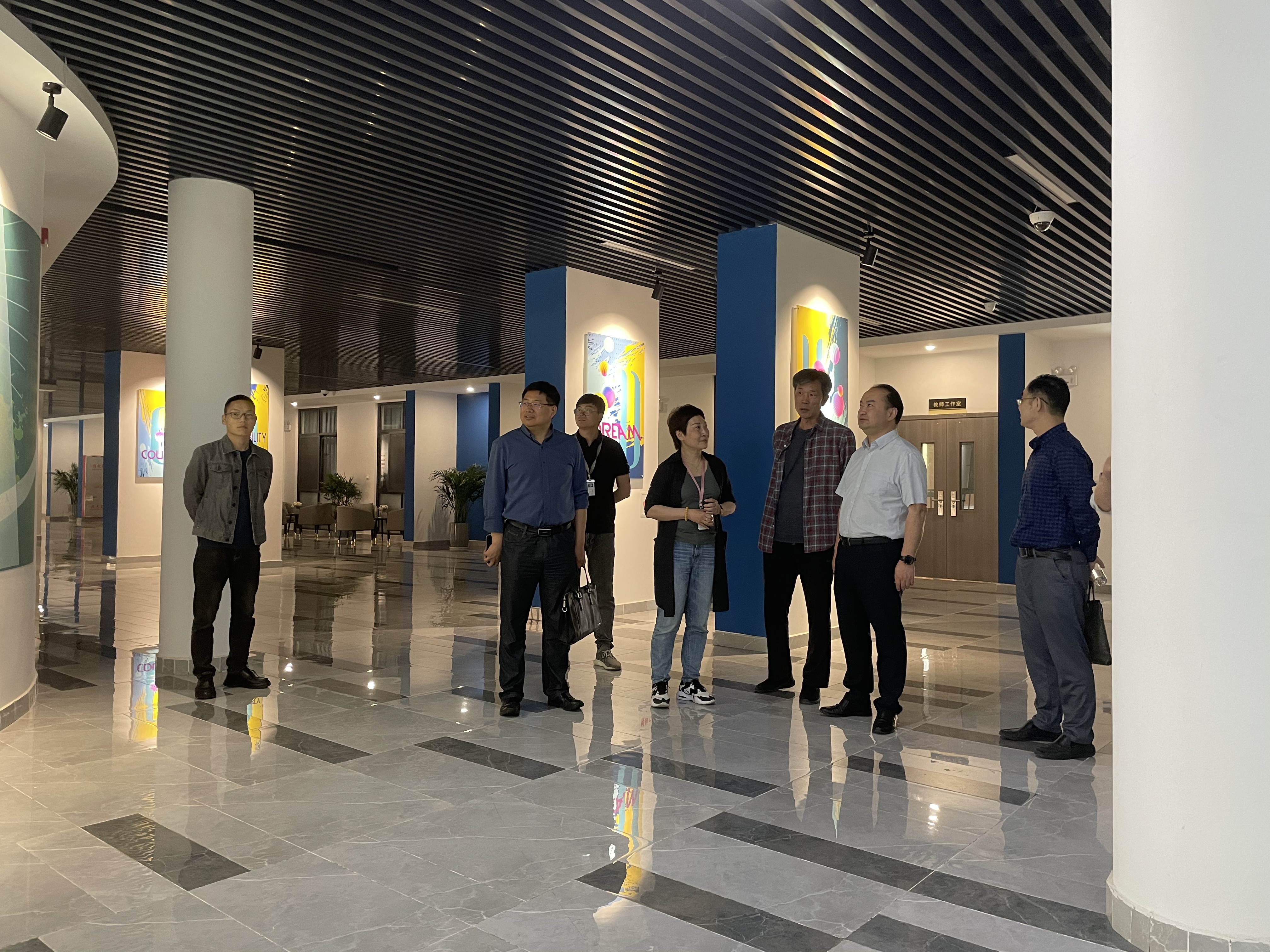 在驻区办公室主任刘岚、杜传锋的陪同下,陶勇一行来到B3一楼连廊检查验收设计装饰工作落实情况。现场,刘岚向陶勇汇报了空间设计的基本思路,重点介绍了墙面美化、灯光改造、家具填充以及绿植选购四个部分的装饰细节。陶勇对区域空间呈现的整体效果表示肯定。