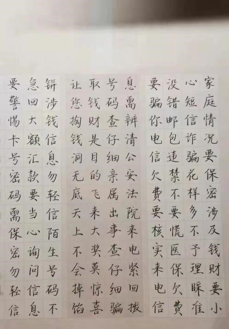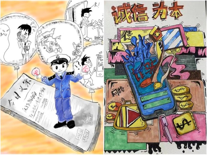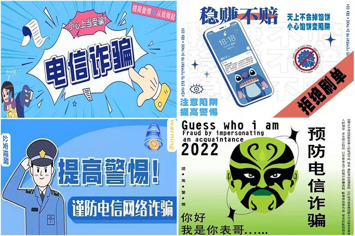 此外,为进一步提升学生应对反诈防骗的积极性与参与度,学院天目湖校区在各班级开展“反诈骗主题接力”文创评比活动。同学们充分发挥专业优势及特长爱好,以短视频、海报、手抄报、书法等文创作品,接力宣传,不断加深反诈防骗意识。