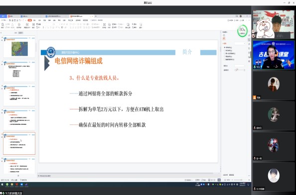 310-11日,各班级采用线上、线下不同形式召开反诈防骗主题教育班会。班会邀请古县街道派出所副所长虞俊、卞力,民警强浩、王淦开展防范电信网络诈骗专项讲座,通过法律知识宣讲和典型案例分析,具体介绍常见网络骗术,教授反诈应对措施,同学们纷纷表示有很大收获。