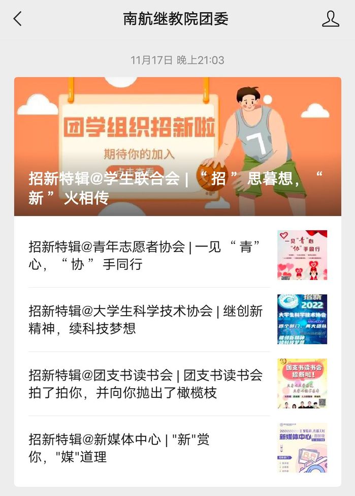 考虑当前疫情形势,今年招新采取“线上+线下”相结合的模式,学院团委通过前期精心策划,于11月中旬进行线上宣传,充分利用微信公众号、宣传海报、团支部微信群等平台,对学院团学组织各部门的职能职责和工作亮点做了介绍,提前通过线上的形式开展招新宣传。