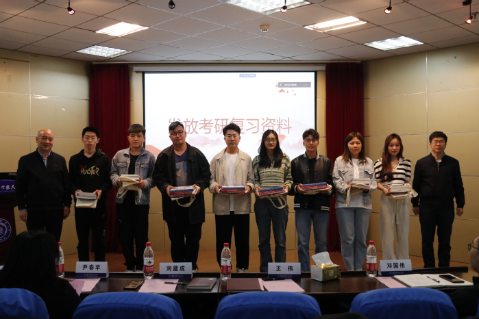 会上,刘建成书记、王伟院长为2024届考研学生代表发放了考研资料复习。