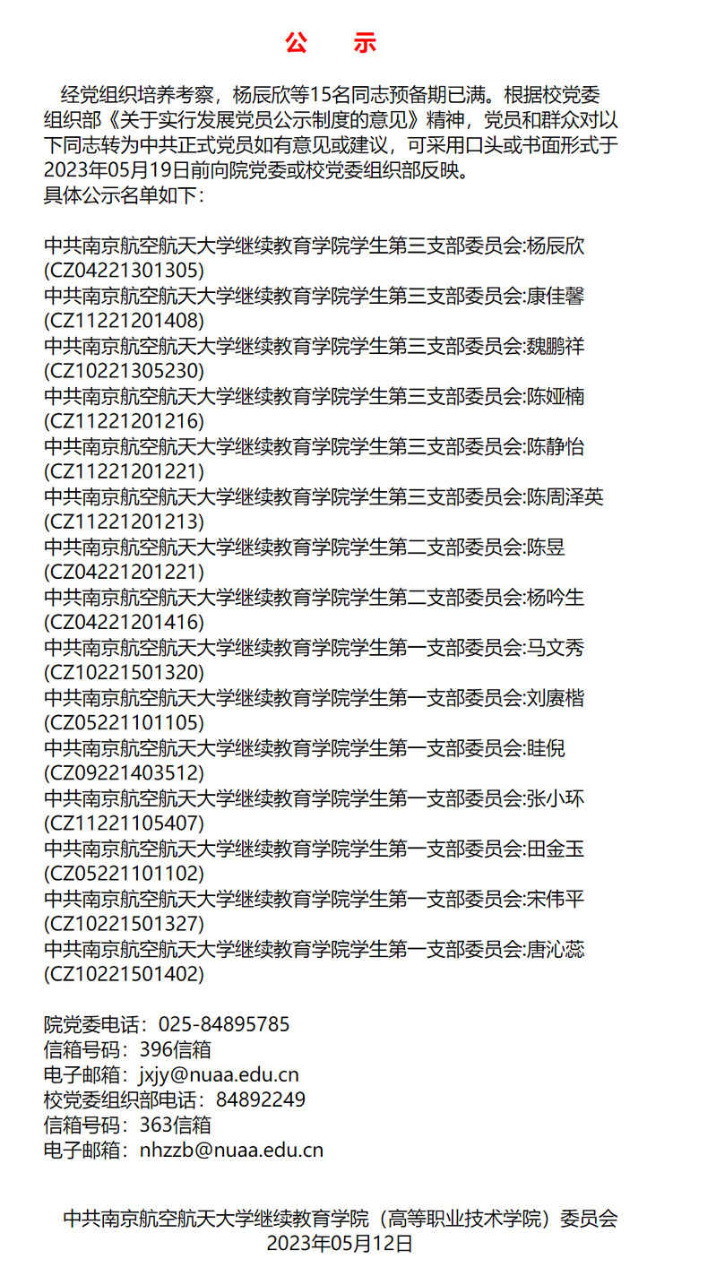 2023年5月杨辰欣等15名预备党员转正公示
