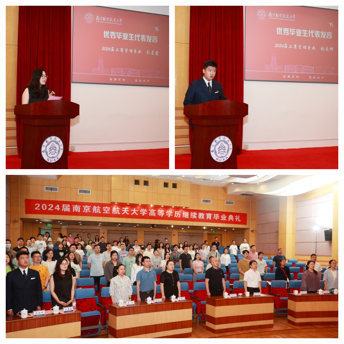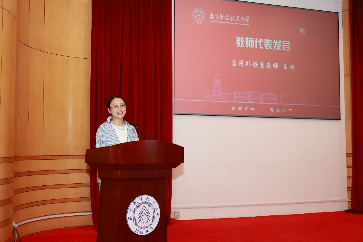 应用外语系的王娅老师代表教师发言,她以“感念、叮嘱、期盼”三个关键词,深情地表达了对毕业生的祝福和期望,鼓励同学们要脚踏实地,勇敢拼搏,行稳致远,努力成为闪闪发光的南航继教人。