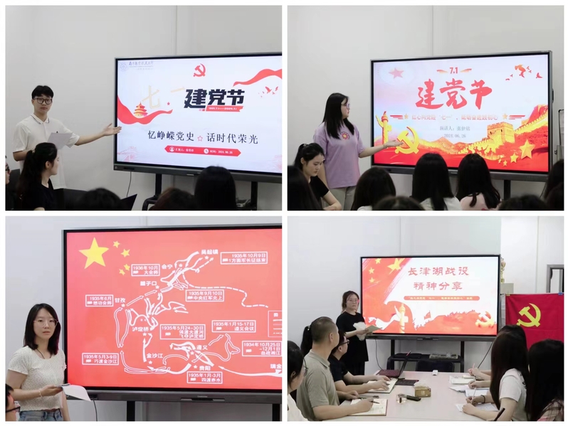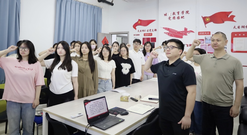 为庆祝中国共产党成立103周年,弘扬伟大建党精神,深入贯彻党的教育方针,为党育人,为国育才,将远大理想、过硬本领、责任担当,坚实地写在祖国大地上。6月26日,学院天目湖校区党支部开展以“红心向党迎‘七一’,砥砺奋进践初心”为主题的“七一”庆祝建党103周年主题党日活动。活动分为:红色故事分享、党史知识竞答、专题党课、重温入党誓词四个部分。