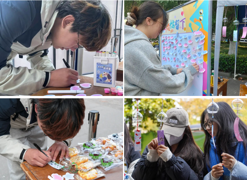 活动现场氛围热烈且温馨,共设置了“解忧杂货铺”区、“风铃DIY”区、“植物&解压玩具领取”区三个别具特色的区域,吸引了众多同学的积极参与。学院党委书记刘建成、副书记尹春苹、副院长江爱华和相关科室负责人也参加了活动,他们亲切地与同学们交流,倾听同学们的想法,并且用自己的人生经验和温暖话语,为那些写下烦恼的同学给出真挚的建议和贴心的鼓励。