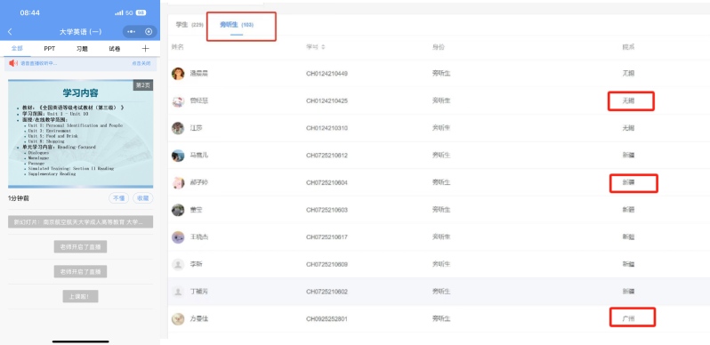 应用外语系徐源副教授先行先试,积极探索《大学英语》的“1+X”课堂教学设计,构建“课前-课中-课后”全场景教学模式。课前推送音频、视频预习资料,助力学生提前熟悉内容;课上通过答题、弹幕互动,激发学生参与热情,营造活跃氛围。3月29日上午,徐源老师在南航本部的实时课堂同步向新疆、贵州、广州等教学点成教师生开放,演绎了一场3000人跨越时空、共上一门课的精彩画卷。因工作原因错失上课的学生通过直播回放接续学习,有效弥补工学矛盾带来的遗憾。学习期间,通过点击某页PPT上的“不懂”按钮,精准定位学习薄弱环节,有助于及时查漏补缺。这一创新实践不仅推动优质教育资源的跨区域共享,更开创了“校本部引领、多区域联动”的高等学历继续教育的教学组织新范式,为破解成人教育地域壁垒、解决成人工学矛盾提供了可复制的南航方案。