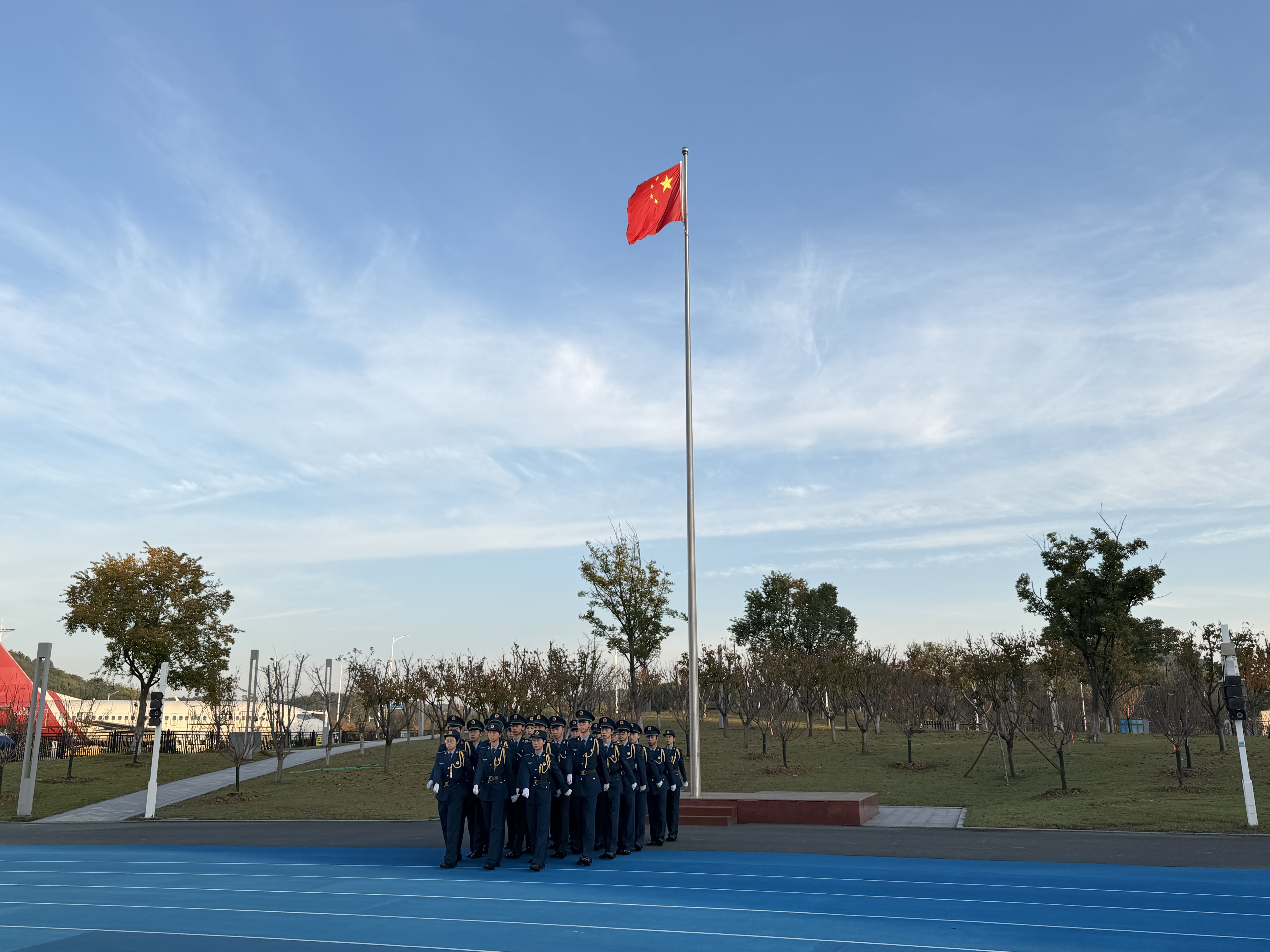 晨光微熹,国旗班队员身着笔挺制服,以沉稳的步伐踏响校园的清晨,护持鲜红五星红旗入场,当《义勇军进行曲》的激昂旋律在天目湖校区上空回荡,全体师生肃立行礼,注视国旗冉冉升起。那一抹炽热的中国红,将爱国情怀与航空报国的使命深植于每位学子心中。