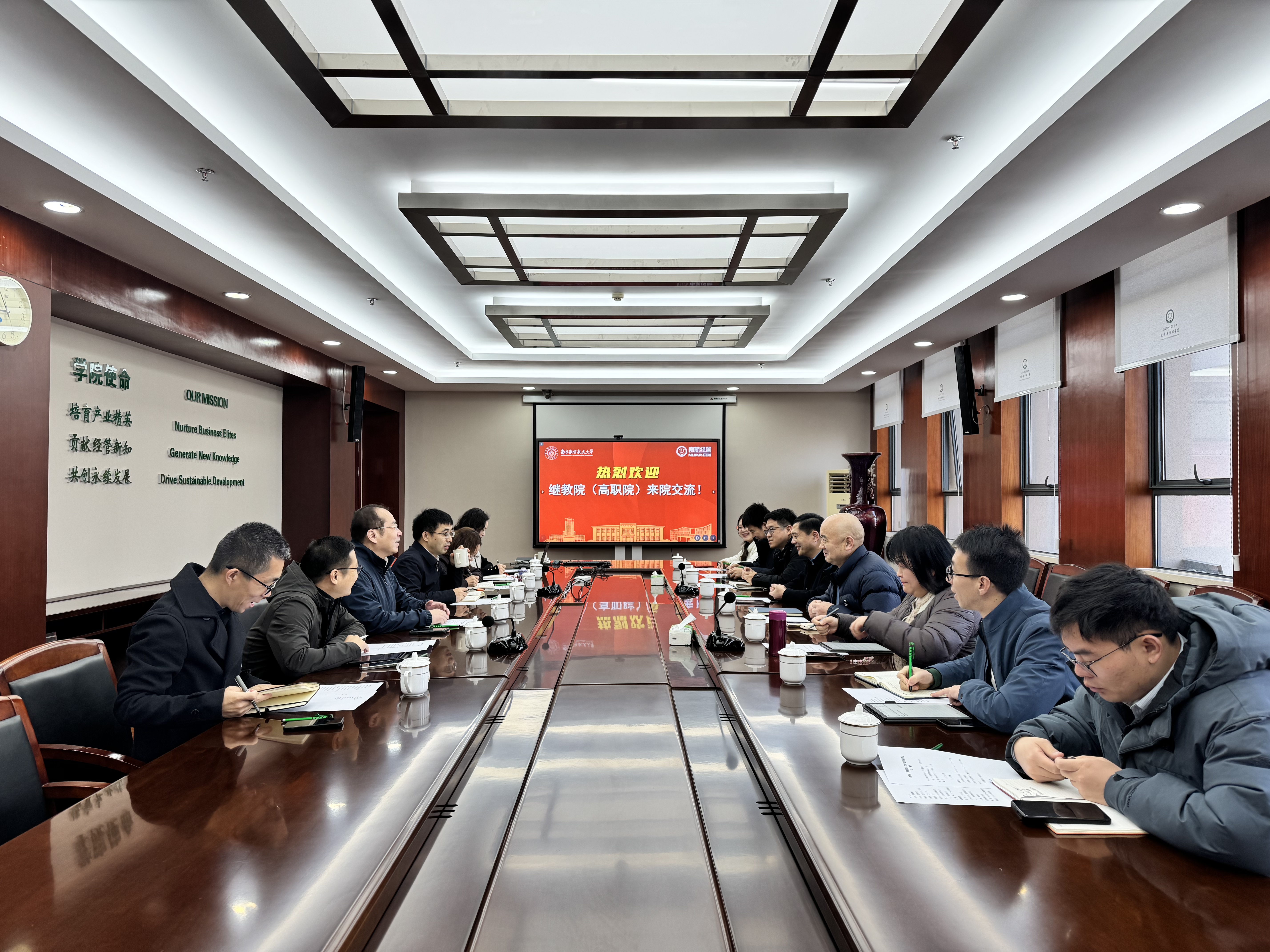 为加强院际交流、凝聚合作共识,共同探索高质量发展新路径,12月18日上午,学院党委书记刘建成、院长江爱华率班子成员及相关部门负责人一行8人赴经济与管理学院开展专题调研交流。经济与管理学院党委书记苏州、院长王群伟及相关班子成员、部门负责人共同参加座谈。双方围绕资源共享、机制创新、协同提升办学效益与社会服务能力等方面进行了深入交流。